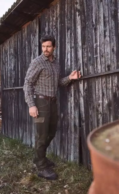 Robust jaktbyxa av mjuk kohud i kontrasterande design. Det slitstarka lädret har ett polyesterfoder på insidan för enkel på- och avtagning. Två cargofickor med tryckknappsstängning, en ficka med dragkedja på höger lår och en bakficka med knapp. Benändarna är dubbla på insidan för att skydda mot nötning från stövlar.