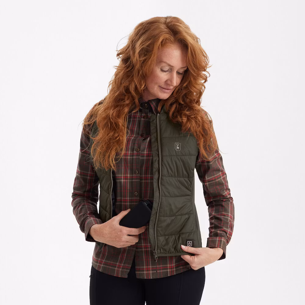 Ribbad halsringningTöjbart tyg i sidan för bättre passform och rörelsefrihetElastisk kant vid ärmöppningenElastisk kant nedtillIntegrerat värmesystemPÅ/AV-knapp framtill Tre värmenivåerMaskintvättbarPowerbank ingår ejVi rekommenderar att du använder en powerbank på 5 000 mAh