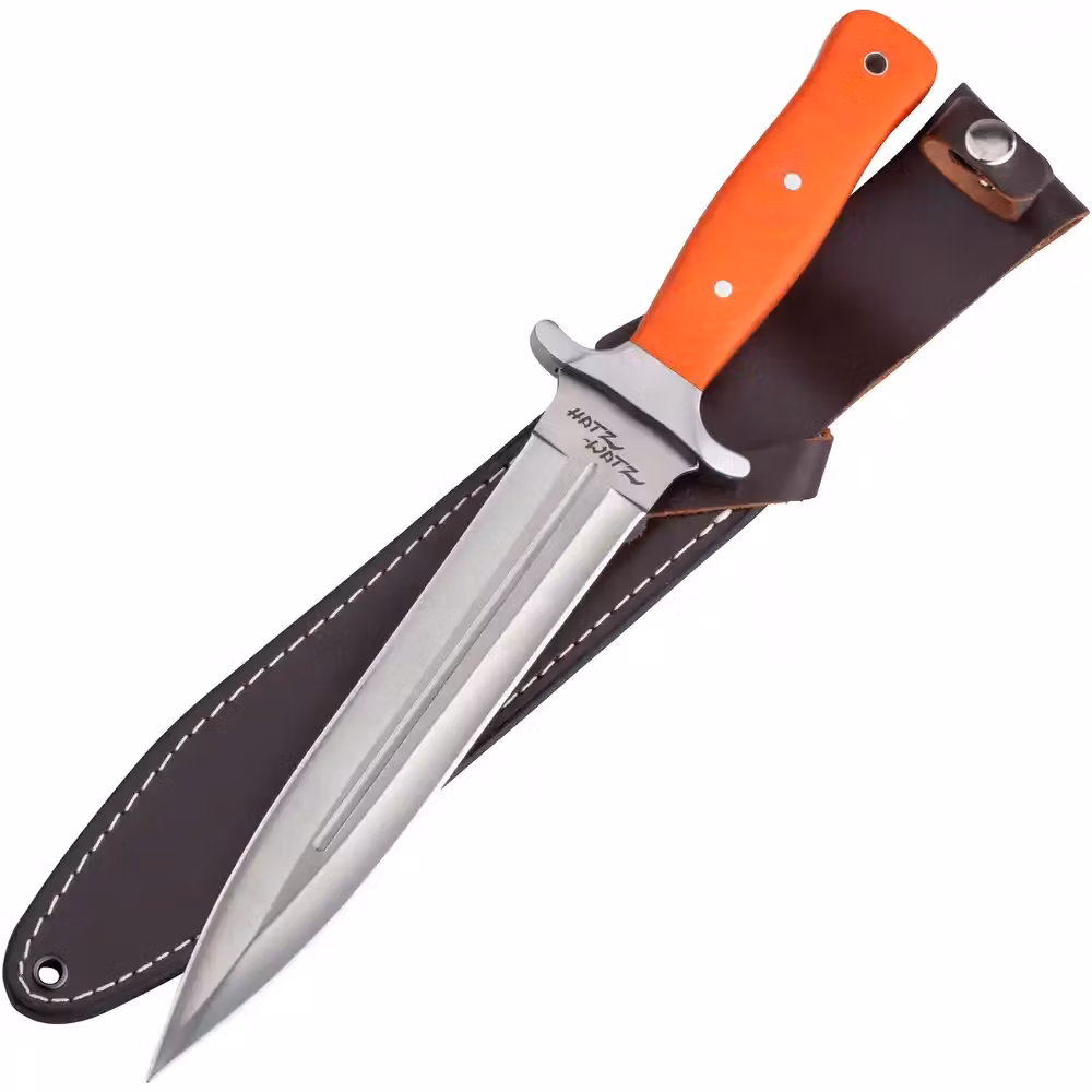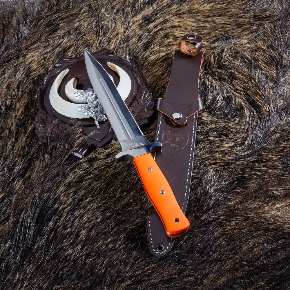 Full-Tang konstruktion 23 cm långt blad med ensidig fuller expansivt pareringselement hållbara G10 handtag inklusive läderslida. Parforce Hatz-Watz Boar Hunter är lämplig för att fånga av vilt. Det 4 mm tjocka bladet, slipat på båda sidor med ett spår på ena sidan, är tillverkat av rostfritt 440A stål. Parerskyddet möjliggör säkert arbete. Handtagen är gjorda av slitstark orange G10, vilket ger ett mycket bra grepp. Med en praktisk ögla för att fästa en rem. Inkluderar läderslida med dubbel remsäkerhet. Tekniska specifikationer: Bladlängd: 23 cm Bladstål: 440A Bladtjocklek: 4 mm Bladbredd: 4 cm Handtagslängd: 12,5 cm Handtagsmaterial: G10 Total längd: 38 cm Vikt: 450 g
